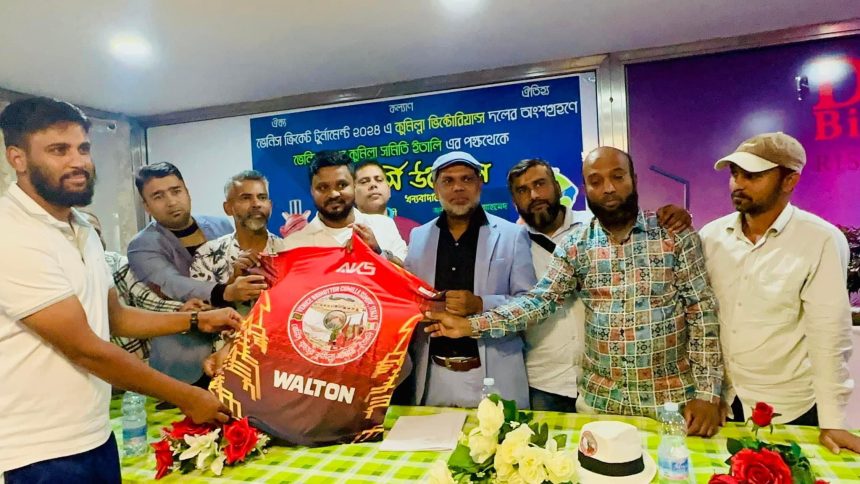ইতালির ভেনিসে জবানী পেরলা উমানিতা’র ক্রিকেট টুর্নামেন্ট উপলক্ষ্যে কুমিল্লা ভিক্টোরিয়া দলের জার্সি উন্মোচন ও আলোচনা সভা অনুষ্ঠিত হয়েছে।স্থানীয় ঢাকা বিরিয়ানি হাউজে সভায় ভেনিস বৃহত্তর কুমিল্লা সমিতি সভাপতি কুদ্দুস চৌধুরী’র সভাপতিত্বে এবং সাধারণ সম্পাদক ফয়সাল আহমেদ এর পরিচালনায় আলোচনা সভা অনুষ্ঠিত হয়।সভায় বক্তব্য রাখেন,সমিতির উপদেষ্টা পরিষদের সদস্য সচিব নেমাল চৌধুরী,১নং সদস্য সাংবাদিক মাকসুদ রহমান,ব্রাক্ষণবাড়িয়া জেলা সমিতির সাধারণ সম্পাদক ইকবাল হোসেন,সাংগঠনিক সম্পাদক ইলিয়াস মিয়া,মোখলেস সরকার সহ আরো অনেকে।