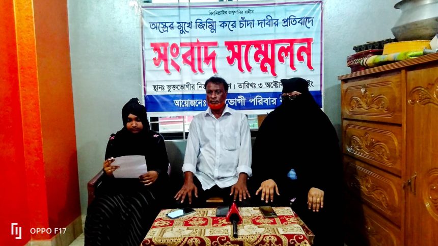 গাজীপুর মহানগরীর টঙ্গীতে অস্ত্রের মুখে জিম্মি করে চাঁদা দাবীর প্রতিবাদে সংবাদ সম্মেলন করেছেন আমির হোসেন মোল্লা নামে এক ব্যক্তি ও তার পরিবার। বৃহস্পতিবার বিকেলে তার নিজ বাসভবনে এই সংবাদ সম্মেলন অনুষ্ঠিত হয়।