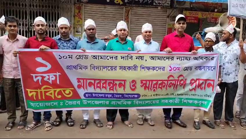 কিশোরগঞ্জের ভৈরবে সহকারী শিক্ষকদের ১০ম গ্রেড প্রদানের ১ দফা দাবিতে মানববন্ধন ও স্মরকলিপি প্রদান করেছে বিভিন্ন প্রাথমিক বিদ্যালয়ের শিক্ষকরা। শুক্রবার (৪ অক্টোবর) সকালে উপজেলা পরিষদের সামনে মানববন্ধনের আয়োজন করা হয়। মানববন্ধন শেষে শিক্ষকদের পক্ষ থেকে একটি লিখিত স্মারকলিপি উপজেলা নির্বাহী অফিসার বরাবর প্রদান করা হয়। স্মারকলিপিটি অন্তর্বর্তীকালীন সরকারের প্রধান উপদেষ্টার কাছে পৌঁছাতে উপজেলা নির্বাহী অফিসারের কাছে দেয়া হয়েছে বলে জানা যায়।