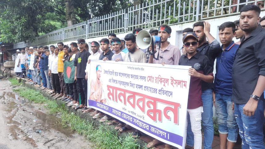 বৈষম্য বিরোধী ছাত্র আন্দোলনের অন্যতম সদস্য যশোর ক্যান্টনমেন্ট কলেজের অর্থনীতি বিভাগের চতুর্থ বর্ষের ছাত্র রকিবুল ইসলামের বিরুদ্ধে মিথ্যা মামলা প্রত্যাহারের দাবীতে মাগুরা জেলার সর্বস্তরের জনগণের ব্যানারে মানববন্ধন অনুষ্ঠিত হয়েছে।