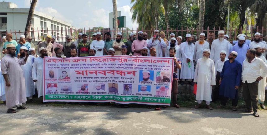 পিরোজপুরে এহসান গ্রুপে জমা টাকা ফেরত পাওয়ার দাবিতে গ্রাহকদের মানববন্ধন