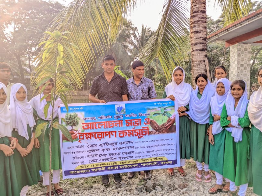 বরগুনা জেলার পাথরঘাটা উপজেলায় স্বপ্নযাত্রী একতা ফাউন্ডেশন এর উদ্যোগে জলবায়ু পরিবর্তন রোধে করণীয় বিষয়ক আলোচনা সভা ও বৃক্ষরোপণ কর্মসূচি পালিত হয়েছে। অদ্য ৪ অক্টোবর রোজ সোমবার বিকাল তিনটায় তালুকের চরদুয়ানী মাধ্যমিক বিদ্যালয় এই অনুষ্ঠান অনুষ্ঠিত হয়।তালুকের চরদোয়ানী মাধ্যমিক বিদ্যালয়ের প্রধান শিক্ষক সুজন কৃষ্ণ হাওলাদার এর সভাপতিত্বে বৃক্ষরোপণ কর্মসূচি অনুষ্ঠিত হয়। উক্ত অনুষ্ঠানে অতিথি হিসেবে উপস্থিত ছিলেন বাংলাদেশ সাংবাদিক কল্যাণ পরিষদের বরগুনা জেলার সভাপতি মোঃহাফিজুর রহমান। মারশার এগ্রোভেট এর বরগুনা জেলার দায়িত্বে নিয়োজিত টেরিটোরি অফিসার মোঃ খাইরুল ইসলাম। স্বপ্নযাত্রী একতা ফাউন্ডেশন এর সাধারণ সম্পাদক মোঃ রেজাউল ইসলাম,তালুকের চড়দুয়ানী মাধ্যমিক বিদ্যালয়ের শিক্ষকমন্ডলী,স্বপ্নযাত্রী একতা ফাউন্ডেশনের, প্রচার সম্পাদক আক্তারুজ্জামান সুবজ, দপ্তর সম্পাদকঃ মোঃ সোহান,ক্রিয়া সম্পাদক মোসাঃ ফারজানা আক্তার, মোসাঃ মারিয়া আক্তার মিনা উপ-ক্রিয়া সম্পাদক, মোসাঃ মরিয়ম,তানজিলা সহো বিদ্যালয়ের ছাত্র-ছাত্রীবৃন্দ এবং স্থানীয় সচেতন মানুষ অংশগ্রহণ করেন।