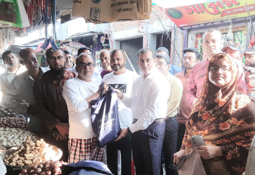 বাজার থেকে পলিথিন মুক্ত করতে মাগুরায় বিনা মূল্যে কাপড়ের ব্যাগ বিতরণ।