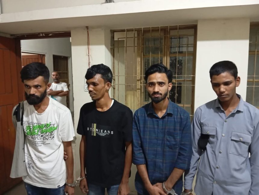 কিশোরগঞ্জের ভৈরবে মাদকসহ চিহ্নিত ৪ ছিনতাইকারী আটক করেছে ভৈরব শহর ফাঁড়ি পুলিশ সদস্যরা। আজ ১৬ নভেম্বর সন্ধ্যা ৭ টায় পৌর শহরের ঘোড়াকান্দা এলাকা থেকে তাদের আটক করা হয়। এ তথ্য নিশ্চিত করেছেন ভৈরব থানা অফিসার ইনচার্জ মো. হাসমত উল্লাহ।