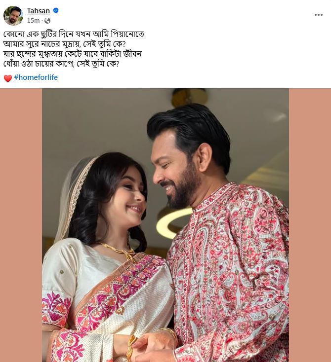 তাহসান খান সামাজিক যোগাযোগমাধ্যমে ফেসবুক পোস্টে বিয়ের একটি ছবি প্রকাশ করেন। ক্যাপশনে লেখেন, কোনো এক ছুটির দিনে যখন আমি পিয়ানোতে; আমার সুরে নাচের মুদ্রায়; সেই তুমি কে? যার ছন্দের মুগ্ধতায় কেটে যাবে বাকিটা জীবন; ধোঁয়া ওঠা চায়ের কাপে, সেই তুমি কে?