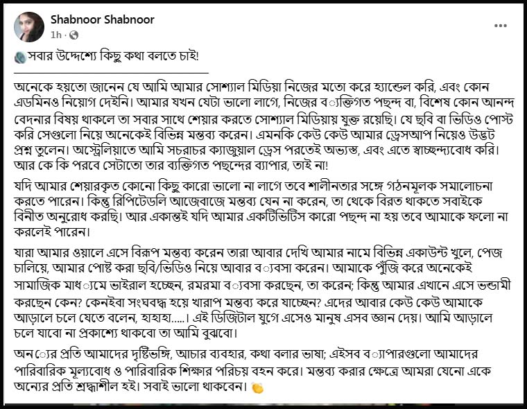 তিনি লিখেছেন, ‘যদি আমার শেয়ারকৃত কোনো কিছু কারো ভালো না লাগে, তবে শালীনতার সঙ্গে গঠনমূলক সমালোচনা করতে পারেন। কিন্তু রিপিটেডলি আজেবাজে মন্তব্য যেন না করেন, তা থেকে বিরত থাকতে সবাইকে বিনীত অনুরোধ করছি। আর একান্তই যদি আমার অ্যাক্টিভিটিস কারো পছন্দ না হয়, তবে আমাকে ফলো না করলেই পারেন।’