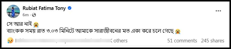 এদিন সোশ্যাল মিডিয়া ফেসবুক ভেরিফায়েড পেজে এক পোস্টে তনি জানান, ‘সে আর নাই। ব্যাংকক সময় রাত ৩টা ৩ মিনিটে আমাকে সারাজীবনের মতো একা করে চলে গেছে।’ তার এই পোস্ট মুহূর্তেই ছড়িয়ে পড়েছে। সেখানে মন্তব্যের ঘরে শোকবার্তা জানাচ্ছেন তনির ভক্ত-শুভাকাঙ্ক্ষী ও নেটিজেনরা।