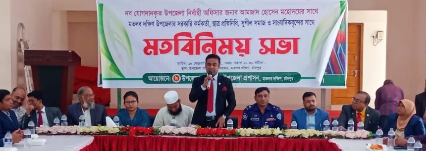 মতলব দক্ষিণ উপজেলা প্রশাসনের আয়োজনে রাজনৈতিক, সামাজিক, সাংস্কৃতিক ব্যক্তিবর্গ, জনপ্রতিনিধি এবং সাংবাদিকদের সাথে নবনিযুক্ত উপজেলা নির্বাহী কর্মকর্তা আমজাদ হোসেনের মতবিনিময় সভা অনুষ্ঠিত হয়েছে। মঙ্গলবার (১৮ ফেব্রুয়ারী) বেলা ১১ টায় উপজেলা পরিষদ হল রুমে এ মতবিনিময় সভা অনুষ্ঠিত হয়।