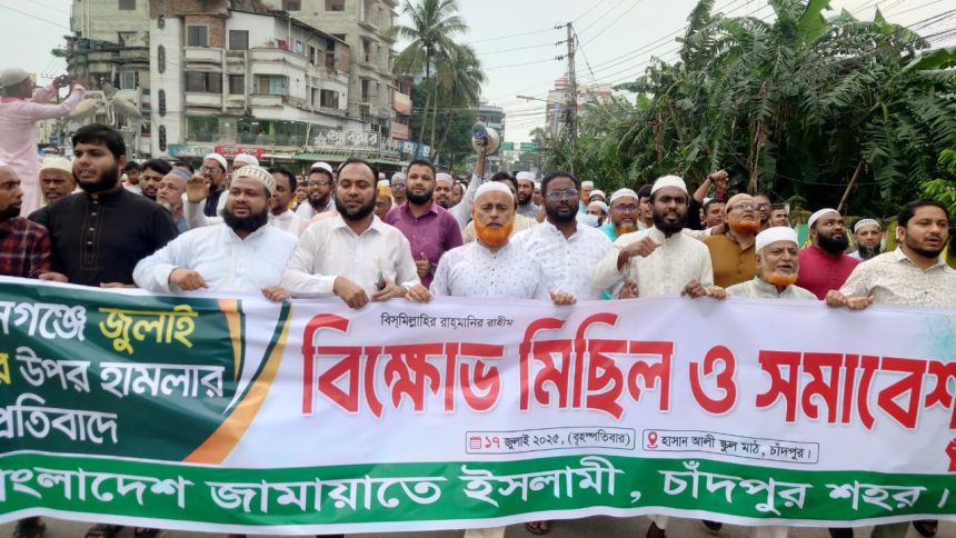 গোপালগঞ্জে জুলাই যোদ্ধাদের উপর হামলার প্রতিবাদে চাঁদপুর জামায়াতের বিক্ষোভ সমাবেশ ও মিছিল