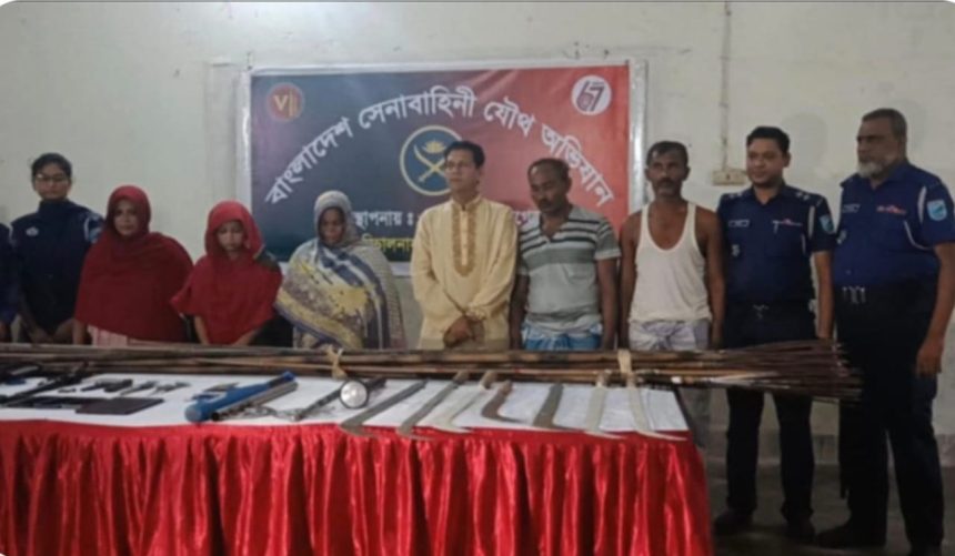 আটককৃতরা হলেন, ঘুনসী গ্রামের শাহ আলম মাতুব্বরের ছেলে কালাম মাতুব্বর (৫৩), মৃত আব্দুল করিম মাতুব্বরের ছেলে মিলন মাতুব্বর (৫৪), শাহ আলম মাতুব্বরের আরেক ছেলে মনু মাতুব্বর (৫০), কালাম মাতুব্বরের স্ত্রী লাকি বেগম (৪৫), মফিজ মাতুব্বরের স্ত্রী পারুল বেগম (৪৫) এবং শিহাব মাতুব্বরের স্ত্রী খাদিজা আক্তার (২৩)।