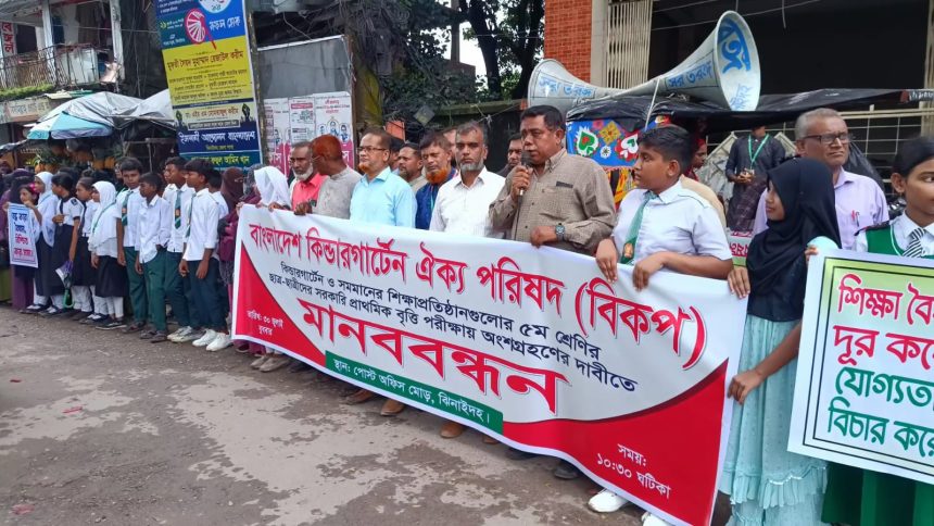 কিন্ডারগার্টেন ও সমমানের শিক্ষা প্রতিষ্ঠান গুলোর ৫ম শ্রেণির ছাত্র-ছাত্রীদের সরকারি প্রাথমিক রৃত্তি পরীক্ষায় অংশ গ্রহণের দাবীতে ঝিনাইদহে মানববন্ধন কর্মসূচি পালিত হয়েছে। বুধবার (৩০ জুলাই) সকাল ১১টার সময় শহরের পোস্ট অফিস মোড়ে বাংলাদেশ কিন্ডারগার্টেন ঐক্য পরিষদ (বিকপ)’র আয়োজনে ঘন্টা ব্যাপী এ কর্মসূচি পালিত হয়।
