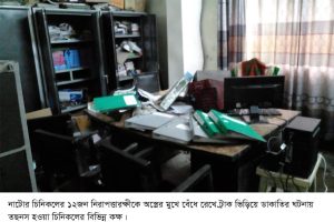 এ ঘটনায় নাটোর সদর থানার ভারপ্রাপ্ত কর্মকর্তা (ওসি) মাহাবুব রহমান জানান, প্রাথমিকভাবে নিরাপত্তা ইনচার্জ আলাফাত কামালসহ কয়েকজনকে জিজ্ঞাসাবাদের জন্য পুলিশ হেফাজতে নেওয়া হয়েছে। দায়িত্বে অবহেলার অভিযোগে সহকারী হাবিলদার বদর উদ্দিন বেগ, নিরাপত্তাকর্মী সাব্বির এবং আরও একজনকে তাৎক্ষণিকভাবে চাকরি থেকে অব্যাহতি দেওয়া হয়েছে।