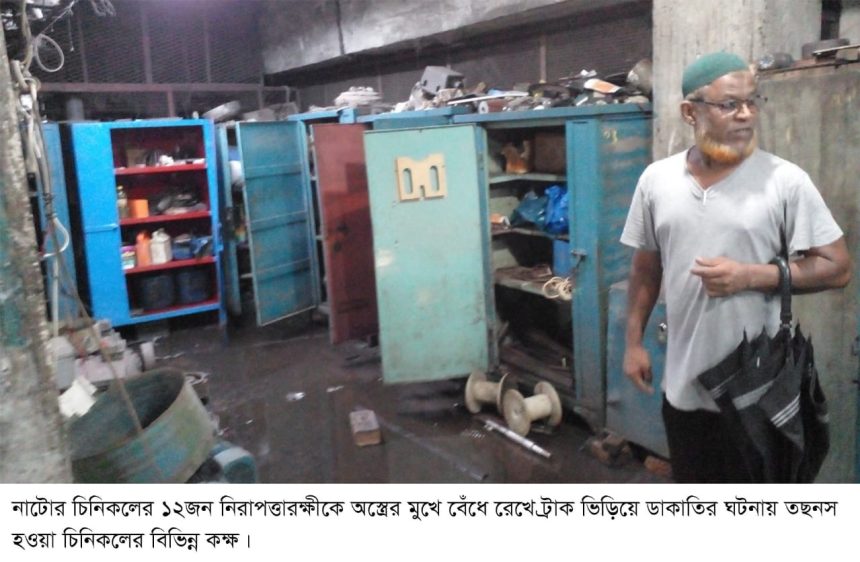নাটোর চিনিকলে সংঘটিত হয়েছে চাঞ্চল্যকর ডাকাতির ঘটনা। শনিবার (২ আগস্ট) দিনগত রাত দেড়টার দিকে চিনিকলের পেছনের ভাঙা দরজা দিয়ে ঢুকে একদল সশস্ত্র দুর্বৃত্ত প্রায় কোটি টাকার মালামাল লুট করে নিয়ে গেছে। দুর্বৃত্তরা ডাকাতির সময় মিলের ১২ জন নিরাপত্তাকর্মীকে অস্ত্রের মুখে জিম্মি করে হাত-পা বেঁধে রাখে।