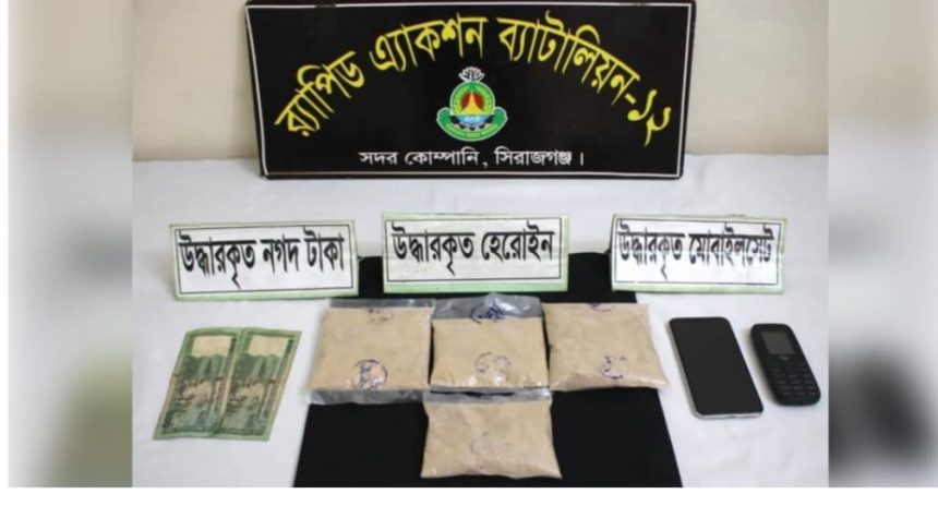 সিরাজগঞ্জের সলংগা থানা এলাকায় র‌্যাপিড অ্যাকশন ব্যাটালিয়ন (র‌্যাব-১২) ৩২৮ গ্রাম হেরোইনসহ এক নারী মাদক ব্যবসায়ীকে গ্রেফতার করেছে। র‌্যাব সদর কোম্পানির কমান্ডার অতিরিক্ত পুলিশ সুপার দীপংকর ঘোষ বৃহস্পতিবার (১৪ আগস্ট) এক প্রেস বিজ্ঞপ্তির মাধ্যমে এ তথ্য নিশ্চিত করেছেন।