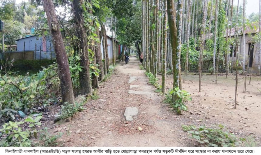 শেরপুরের ঝিনাইগাতী-ধানশাইল (আরএইচডি) সড়ক সংলগ্ন হযরত আলীর বাড়ি হতে মোল্লাপাড়া কবরস্থান পর্যন্ত সড়কটি দীর্ঘদিন ধরে সংস্কার না করায় খানাখন্দে ভরে গেছে। বেশিরভাগ অংশে পিচ উঠে গিয়ে সৃষ্টি হয়েছে ছোট বড় গর্তের। ফলে সড়কটি এখন চলাচলের অযোগ্য হয়ে পড়েছে। এ কারণে স্থানীয়দের ভোগান্তি পোহাতে হচ্ছে। দীর্ঘদিন সংস্কার না করায় সড়কগুলো ব্যবহারের অনুপযোগী হয়ে পড়েছে। সড়কটি অবস্থা এতটাই খারাপ যে যানবাহন তো দূরের কথা, পথচারীদেরও চলাচল করতে কষ্ট হচ্ছে। এ সড়ক সংস্কারের দাবিতে এলাকাবাসী ক্ষোভে ফুঁসে উঠছে।