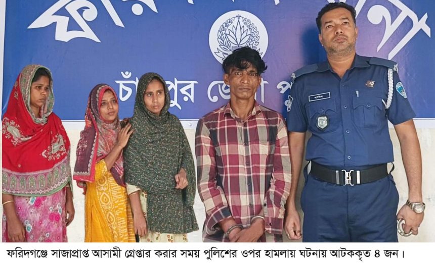 স্থানীয় ও পুলিশ সূত্রে জানা যায়, শনিবার রাতে গোপণ সংবাদে খবর পেয়ে চুরির মামলায় ১ বছরের সাজাপ্রাপ্ত আসামী মো. ফারুক হোসেনকে তার বাড়ি থেকে গ্রেপ্তার করে হাতকড়া পরিয়ে নিয়ে আসার সময় তার স্বজন ও স্থানীয় একটি চক্র পুলিশের ওপর হামলা করে। পুলিশের সাথে ধস্তাধস্তির এক পর্যায়ে হাতকড়া পড়া অবস্থায় আসামী ফারুক হোসেন পালিয়ে যায়। এসময় দুইজন এএসআই আহত হয়। সংবাদ পেয়ে ফরিদগঞ্জ থানা পুলিশের বেশ কয়েকটি দল রাতভর অভিযান চালিয়ে পালিয়ে যাওয়া আসামী ফারুক হোসেন ও পুলিশের ওপর হামলার ঘটনায় অভিযুক্ত ফারুকের স্ত্রীসহ৩ জনকে আটক করা হয়।