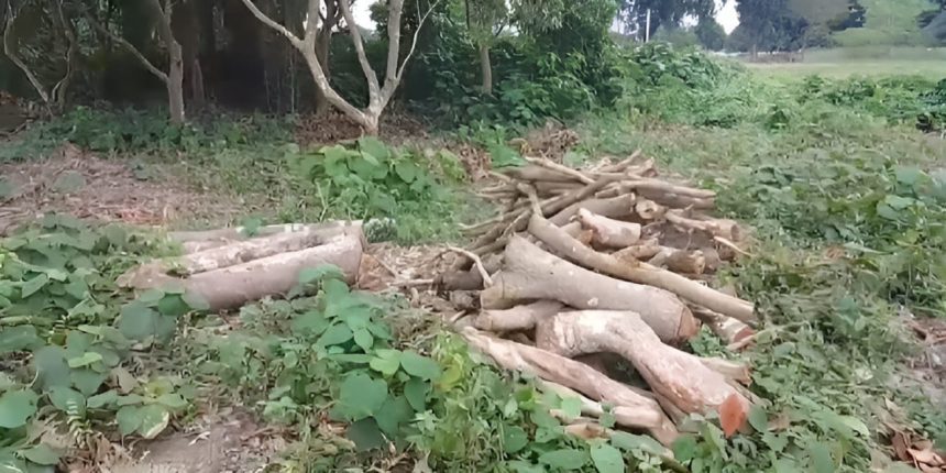 ক্যাম্পাসের পূর্ব পাশে ড্রেন ও সীমানাপ্রাচীর নির্মাণে কয়েক শত গাছ কাটা হয়েছে। শ্রমিকদের টিনের ঘরের পাশে কাটা আমগাছ পড়ে আছে। দক্ষিণ দিকে কাটা ডালপালা ও ফাঁকা জায়গা দেখা গেছে। পশ্চিমে প্রায় ১০ বিঘার একটি বাগানে সারি সারি গাছ কাটা অবস্থায় পানিতে পড়ে আছে। বৃষ্টির কারণে নিয়ে যাওয়া সম্ভব হয়নি।বিশ্ববিদ্যালয়ের একটি সূত্র দাবি করেছে, ক্যাম্পাস দেখাশোনার দায়িত্বে ছিলেন মোঃ হাফিজুল ইসলাম নামের এক ব্যক্তি। তাঁর গরু ও ভেড়ার ফার্ম অধিগ্রহণ করা হয়েছে। তিনি আমের মৌসুমে ৪০ লাখ টাকার আম বিক্রি করেছেন। একটি রাজনৈতিক দলের সাবেক ছাত্রনেতা নামমাত্র মূল্যে বাগান ইজারা নিয়েছিলেন। গাছ কাটার চক্রের হোতা হাফিজুল, ওই ছাত্রনেতা, হোসাইন কন্সট্রাকশন, রেজিস্ট্রার ডা. হাসিবুল হোসেন, উপাচার্যের সহকারী নাজমুল হোসেন এবং প্রকৌশলী সিরাজুম মুনীর জড়িত বলে অভিযোগ রয়েছে।