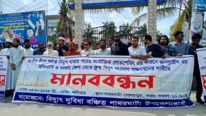 জাতীয় গ্রিডে পর্যাপ্ত বিদ্যুৎ থাকা সত্ত্বেও অযৌক্তিক লোডশেডিংয়ের কারণে জনদুর্ভোগ চরমে — এমন অভিযোগে বরগুনার পাথরঘাটায় মানববন্ধন অনুষ্ঠিত হয়েছে।
