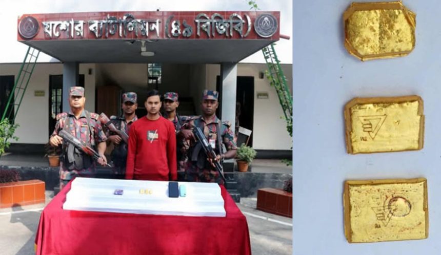 বিজিবি সূত্রে জানা যায়, গোপন সংবাদের ভিত্তিতে যশোর ব্যাটালিয়নের একটি টহলদল যশোর–নড়াইল মহাসড়কের রয়টোকা বাজার এলাকায় অবস্থান নেয়। এ সময় সন্দেহভাজন এক ব্যক্তিকে আটক করে তল্লাশি চালালে তার প্যান্টের পকেটের ভেতর বিশেষ কায়দায় লুকানো অবস্থায় তিনটি স্বর্ণের বার উদ্ধার করা হয়। উদ্ধারকৃত স্বর্ণের মোট ওজন ৩১৯.৪৮ গ্রাম।