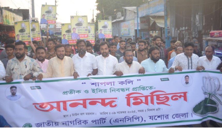 নির্বাচন কমিশনের নিবন্ধন ও শাপলা কলি প্রতীক পাওয়ায় যশোরে আনন্দ মিছিল করেছে জাতীয় নাগরিক পার্টি (এনসিপি)। রোববার বিকেলে এই কর্মসূচি পালন করে দলটি। শহরের টাউন হল মাঠ থেকে আনন্দ মিছিলটি বের হয়। শহরের দড়াটানা, চিত্রা মোড় ও চৌরাস্তা ঘুরে প্রেসক্লাব যশোরের সামনে গিয়ে মিছিল শেষ হয়। চৌরাস্তা মোড়ে সংক্ষিপ্ত পথসভায় বক্তারা বলেন, জুলাই গণ-অভ্যুত্থানের কারণেই আজ আমাদের এই রাষ্ট্রের গণতান্ত্রিক রূপান্তরের সম্ভাবনা তৈরি হয়েছে। এই আন্দোলনে ছাত্র-জনতা জীবন না দিলে গুম- খুন-লুণ্ঠন, দুর্নীতি ও হাসিনার ফ্যাসিবাদী জমানার অবসান ঘটতো না। বিগত দিনে অনেক প্রতাপশালী রাজনৈতিক দলের আন্দোলন দেশবাসী দেখেছে। কিন্তু তাদের সেই আন্দোলন হাসিনার শাসনের অবসান ঘটাতে পারেনি। অথচ যে জুলাই আন্দোলনের ফসল আজকের এই ফ্যাসিবাদমুক্ত বাংলাদেশ, সেই জুলাই সনদের আইনি ভিত্তি নিয়ে জটিলতা সৃষ্টি করা হচ্ছে।