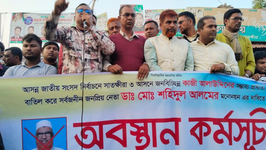 গত ২ নভেম্বর বিএনপি’র দলীয় মনোনয়ন ঘোষণায় সাতক্ষীরা- ৩ (কালিগঞ্জ- আশাশুনি) আসনে ধানের শীষের প্রার্থী হিসেবে সাবেক সংসদ সদস্য আলহাজ্ব কাজী আলাউদ্দিনের নাম ঘোষণার সাথে সাথে তা বাতিল করে ডাক্তার শহিদুল আলমের মনোনয়ন দাবি করে তাৎক্ষণিক প্রতিবাদ ও বিক্ষোভ সমাবেশে নামে দলের নেতাকর্মী ও সমর্থকরা। সেই থেকে গতকাল বৃহস্পতিবার পর্যন্ত লাগাতার ১১ দিন আন্দোলন কর্মসূচি চালিয়ে আসছে কালিগঞ্জ- আশাশুনি উপজেলা বিএনপি’র নেতাকর্মী সমর্থকসহ সর্বস্তরের জনগণ। লাগাতার কর্মসূচির মধ্যে গতকাল ছিল অবস্থান কর্মসূচি।