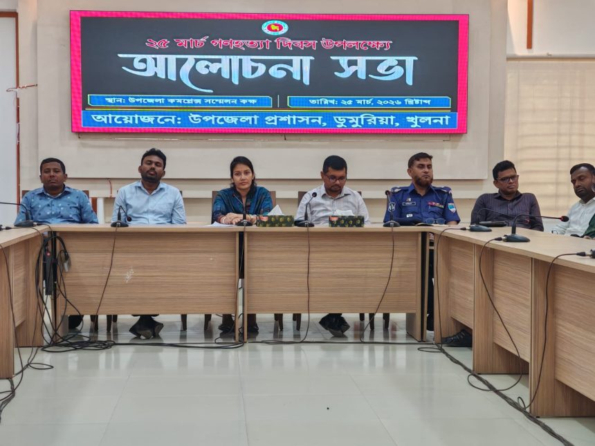 বুধবার সকাল ১০টায় ডুমুরিয়া উপজেলা কমপ্লেক্স সম্মেলন কক্ষে উপজেলা প্রশাসনের আয়োজনে ডুমুরিয়া উপজেলা নির্বাহী অফিসার মিজ সবিতা সরকারের সভাপতিত্বে অনুষ্ঠিত সভায় বক্তব্য দেন ডুমুরিয়া উপজেলা সহকারী কমিশনার ভূমি অমিত কুমার বিশ্বাস, সিনিয়র উপজেলা মৎস্য কর্মকর্তা সোহেল মোঃ জিল্লুর রহমান রিগান, উপজেলা প্রকৌশলী দারুল হুদা, উপজেলা নির্বাচন অফিসার মনোরঞ্জন বিশ্বাস, সমাজ সেবা কর্মকর্তা মনোজ কুমার বিশ্বাস, মাধ্যমিক শিক্ষা অফিসার দেবাশীষ বিশ্বাস, মহিলা বিষয়ক কর্মকর্তা হাঁসি রাণী, পরিবার পরিকল্পনা কর্মকর্তা ডাঃ ফৈদাউসী,প্রাণীসপ্দ ভেটেরিনারি ডাঃ আবু সাঈদ সুমন,জনস্বাস্থ্য প্রকৌশলী শাহাগ্ঙীর আলম, মুক্তি যোদ্ধা কমান্ডার নূরুল ইসলাম মানিক, নূরুন নবী খোকা, শিক্ষক আইয়ুব হুসাইন, সাংবাদিক শেখ মাহতাব হোসেন,এম এ এরশাদ, এম রুহুল আমিন,শেখ জাহিদুর রহমান বিপ্লব,দিপ্তমান বাপ্পী, সুব্রত পোদ্দার, ছাত্র পাপ্পী শেখ, পূজা অধিকারী, শ্রূয়শী মালি রিয়া,সহ শিক্ষক ও ছাত্র ছাত্রী উপস্থিত ছিলেন।