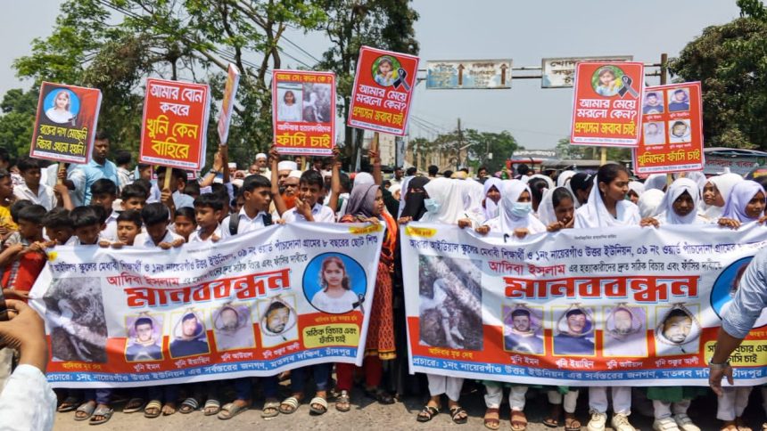 মতলব দক্ষিন উপজেলার ১ নং নায়েরগাঁও উত্তর ইউনিয়নের ৯ নং ওয়ার্ডের পাচদোনা গ্রামে ৮ বছরের শিশু আদিবা হত্যা মামলার আসামিদের ফাঁসির দাবিতে মানববন্ধন অনুষ্ঠিত হয়েছে।