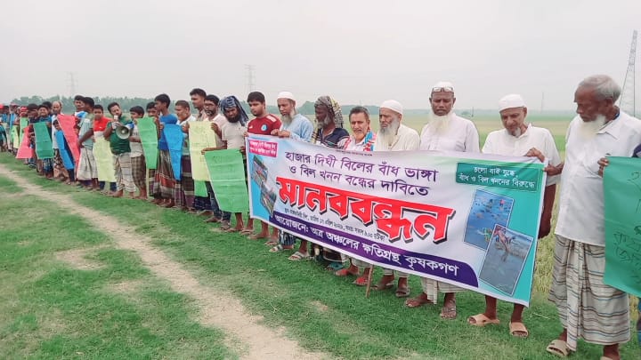 শুক্রবার বিকেলে হাজারবিঘী বিলের ধারে চার শতাধিক কৃষক এই মানববন্ধনে অংশগ্রহণ করেন।