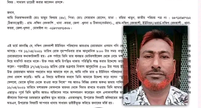 খুলনার কয়রায় এক জামায়াত নেতাকে হত্যার হুমকি দিয়েছেন দক্ষিন বেদকাশি ইউনিয়ন পরিষদের (ইউপি) ভারপ্রাপ্ত চেয়ারম্যান ওসমান গনি খোকন। এ ব্যাপারে ইউপি চেয়ারম্যানের বিরুদ্ধে কয়রা থানায় সাধারণ ডায়রী করেছেন ওই জামায়াত নেতা।