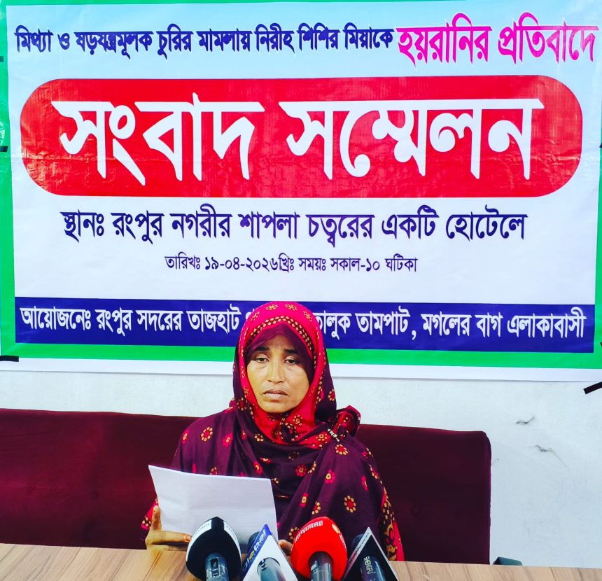 প্রাপ্ত সংবাদ সম্মেলনে জানা গেছে,রংপুর নগরীর তাজহাট থানা এলাকার তালুক তামপাট মোগলেরবাগ গ্রামে দিনমজুর বকুল মিয়ার স্ত্রী মোসাঃ শিউলি বেগম এলাকার শতাধিক গ্রামবাসীকে সাথে নিয়ে সংবাদ সম্মেলনে জানান, ঘটনার দিন গত ২৪ ফেব্রুয়ারি দিবাগত রাতে একই গ্রামের ওমর ফারুক বাড়িতে ছিলেন না বলে ওই রাতেই তার বাড়িতে তালা ভেঙ্গে সংগঠিত হয়। পরে তিনি তাজহাট থানায় একটি চুরির মামলা দায়ের করেন।