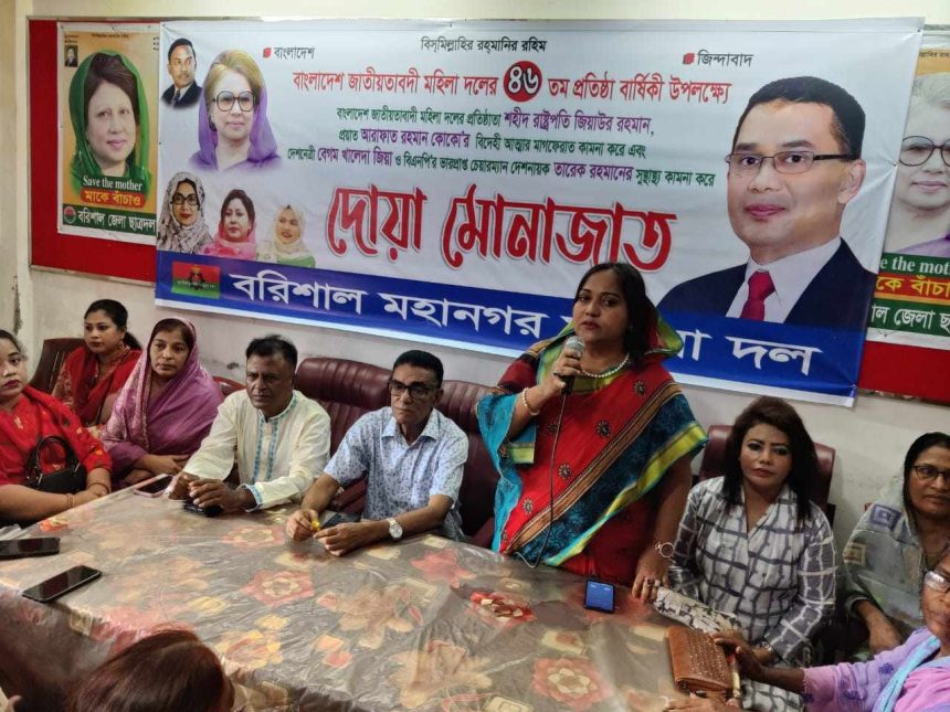 বাংলাদেশ জাতীয়তাবাদী মহিলা দলের ৪৬ তম জন্মদিন উপলক্ষে ৯ আগষ্ট সোমবার সকাল সাড়ে দশটায় বরিশাল নগরীর সদর রোডস্থ বিএনপি দলীয় কার্যালয়ে আলোচনা সভা দোয়া ও মিলাদ মাহফিল অনুষ্ঠিত হয়েছে।