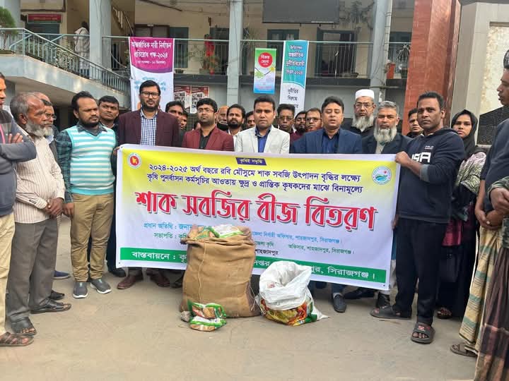 শাহজাদপুর উপজেলা নির্বাহী অফিসার মো. কামরুজ্জামান বলেছেন, বর্তমানে দ্রব্য মূল্য অনেকাংশেই বৃদ্ধি পাচ্ছে। বাড়ির আঙ্গিনায় শাক সবজির বীজ বোপন করে পরিবারের চাহিদা পুরুন করার পরে তা বাজারজাত করলে কৃষকরাও আর্থিক ভাবে উপকৃত হবে। উপজেলা কৃষি সম্প্রসারণ অধিদপ্তরের আয়োজনে শাক সবজির বীজ বিতরণ অনুষ্ঠানে প্রধান অতিথির বক্তব্যে এসব কথা বলেন তিনি। উপজেলা পরিষদ চত্বরে মঙ্গলবার (১০ ডিসেম্বর) দুপুরে উপজেলা কৃষি কর্মকর্তা কৃষিবিদ জেরিন আহমেদ এর সভাপতিত্বে এবং উপজেলা কৃষি সম্প্রসারণ কর্মকর্তা নাহিদুল ইসলামের সঞ্চালনায় বক্তব্য রাখেন, অতিরিক্ত কৃষি অফিসার শুভজিৎ রায়। এ দিন ২০২৪-২৫ অর্থ বছরে রবি মৌসুমে শাক সবজি উৎপাদন বৃদ্ধির লক্ষ্যে কৃষি পুনর্বাসন কর্মসূচির আওতায় ক্ষুদ্র ও প্রান্তিক ৫০০ জন কৃষকের মাঝে বিনামূল্যে হাইব্রিড জাতের আধা কেজি হারে শাক সবজির বীজ বিতরণ করা হয়। এ সময় বিভিন্ন ইউনিয়নের উপ-সহকারী কৃষি কর্মকর্তা, প্রিন্ট ও ইলেকট্রনিক মিডিয়ায় সাংবাদিকবৃন্দ উপস্থিত ছিলেন।