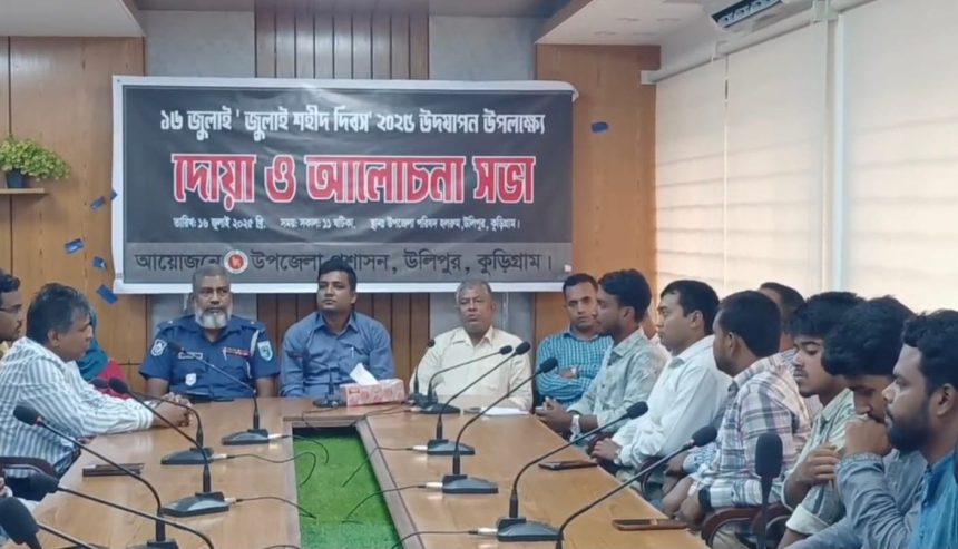 কুড়িগ্রামের উলিপুরে “জুলাই শহিদ দিবস” উপলক্ষে উপজেলা প্রশাসনের আয়োজনে অনুষ্ঠিত হয়েছে আলোচনা সভা ও দোয়া মাহফিল।