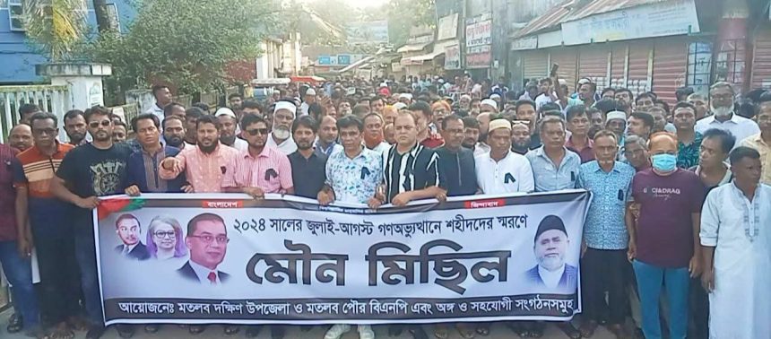 বিএনপির কেন্দ্রীয় কর্মসূচীর অংশ হিসেবে চাঁদপুরের মতলব দক্ষিণে ২০২৪ সালের জুলাই -আগস্ট গণঅভ্যুত্থানে শহীদদের স্মরণে মৌন মিছিল বের করা হয়। ১৮ জুলাই ( শুক্রবার) বিকেলে মতলব উপজেলা ও মতলব পৌর বিএনপি এবং অঙ্গ ও সহযোগী সংগঠনের আয়োজনে মৌন মিছিলটি স্থানীয় রিক্সা স্ট্যান্ড থেকে বের হয়ে বাজারের গুরুত্বপূর্ণ সড়ক প্রদক্ষিণ করে এনএএম টাওয়ারের সামনে সংক্ষিপ্ত আলোচনার মাধ্যমে শেষ হয়। এতে বক্তব্য রাখেন মতলব দক্ষিণ উপজেলা বিএনপির সভাপতি ও মতলব পৌরসভার সাবেক মেয়র এনামুল হক বাদল, মতলব পৌর বিএনপির সভাপতি শোয়েব আহমেদ সরকার, উপজেলা বিএনপির সাধারণ সম্পাদক মোঃ সফিকুল ইসলাম সাগর।