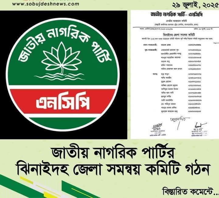 জাতীয় নাগরিক পার্টির (এনসিপি) ঝিনাইদহ জেলার সমন্বয় কমিটি ঘোষণা করা হয়েছে। তারেক রেজাকে প্রধান সমন্বয়কারী ও এ্যাডভোকেট হুমায়রা নূর যুগ্ম সমন্বয়কারী করে সোমবার (২৮ জুলাই) রাত ১০টার সময় কেন্দ্রীয় কমিটির সদস্য সচিব আখতার হোসেন ও মূখ্য সংগঠক (দক্ষিণ) হাসনাত আবদুল্লাহ মুখ্য সংগঠক স্বাক্ষরিত ৩১ সদস্য বিশিষ্ট এই কমিটির অনুমোদন দেয়।