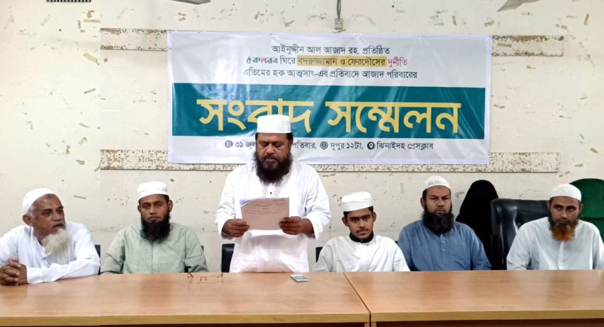 বৃহস্পতিবার (৩১ জুলাই) দুপুরে ঝিনাইদহ প্রেসক্লাব মিলোনায়তনে মরহুম আইনুদ্দীন আল আজাদের পরিবারের পক্ষ থেকে সংবাদ সম্মেলনে লিখিত বক্তব্য পাঠ করেন তার বড় ভাই মোঃ শামসুল আলম।