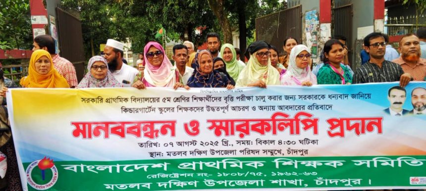 বাংলাদেশ প্রাথমিক শিক্ষক সমিতি মতলব দক্ষিণ উপজেলা শাখার আয়োজনে প্রাথমিক বৃত্তি পরীক্ষা নিয়ে কিন্ডার গার্টেন স্কুলের শিক্ষকদের উদ্ধতপূর্ণ আচরণ অন্যায় আবদারের প্রতিবাদে মানবন্ধন কর্মসূচি পালন করা হয়েছে। আজ বৃহস্পতিবার (৭ আগস্ট ২০২৫) বিকেলে মতলব-বাবুরহাট পেন্নাই সড়কের উপজেলা পরিষদ সম্মুখে এ কর্মসূচি পালন করা হয়।