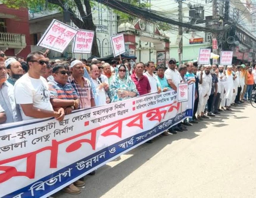 বরিশাল বিভাগ উন্নয়ন ও স্বার্থ সংরক্ষণ কমিটি ২৭ দফা দাবিতে মানববন্ধন করেছে। মঙ্গলবার (১২ আগস্ট) সকাল ১০টায় নগরীর অশ্বিনী কুমার টাউন হলের সামনে অনুষ্ঠিত এই মানববন্ধনে বরিশালের বিভিন্ন শ্রেণী ও পেশার মানুষ অংশগ্রহণ করেন। মানববন্ধনের সভাপতিত্ব করেন অ্যাডভোকেট নজরুল ইসলাম খান রাজন এবং সঞ্চালনা করেন ডা. মিজানুর রহমান। প্রধান অতিথি হিসেবে উপস্থিত ছিলেন বিএনপির চেয়ারপারসনের উপদেষ্টা ও সাবেক হুইপ অ্যাডভোকেট মজিবর রহমান সরোয়ার, বিশেষ অতিথি হিসেবে উপস্থিত ছিলেন শারমিন রফিক। বক্তারা তাদের ২৭ দফা তুলে ধরে অনতিবিলম্বে এসব দাবিগুলো বাস্তবায়নের দাবি জানান। বক্তারা হুঁশিয়ারি দেন যে, যদি তাদের দাবি না মানা হয়, তবে বরিশালসহ গোটা দক্ষিণাঞ্চলবাসীকে সাথে নিয়ে বৃহত্তর আন্দোলন কর্মসূচি ঘোষণা করা হবে। ২৭ দফার দাবিগুলোর মধ্যে উল্লেখযোগ্য হলো: বরিশাল সিটির বাইপাসসহ ভাঙ্গা-বরিশাল-কুয়াকাটা ছয় লেনের মহাসড়ক নির্মাণ, ঢাকা-বরিশাল ডুয়েল গেজ রেল লাইন স্থাপন, বরিশাল-ভোলা সেতু নির্মাণ, এবং বরিশাল বিভাগে একটি আধুনিক স্পেশালাইজড হাসপাতাল নির্মাণ। এছাড়া, বরিশাল বিভাগে একটি ইপিজেড নির্মাণ, বরিশাল বিমানবন্দরকে আন্তর্জাতিক বিমানবন্দরে রূপান্তরকরণ, এবং কুয়াকাটা সমুদ্র সৈকতকে আন্তর্জাতিক মানের পর্যটন কেন্দ্রে রূপান্তরকরণের দাবি জানানো হয়েছে। বক্তারা বরিশাল শহরের খালগুলো পুনরুদ্ধার ও আধুনিক বর্জ্য ব্যবস্থাপনা প্রকল্প স্থাপনের কথাও উল্লেখ করেন। দক্ষিণাঞ্চলের স্বাস্থ্যসেবা উন্নয়নের জন্য বরিশাল শের-ই বাংলা চিকিৎসা মহাবিদ্যালয় হাসপাতালের শয্যা সংখ্যা এক হাজারে উন্নীতকরণ এবং বরিশাল জেনারেল হাসপাতালের শয্যা সংখ্যা ২৫০ এ উন্নীতকরণের দাবি করা হয়। বক্তারা বরিশাল শহরে পানীয় জল বিশুদ্ধকরণ ও বিতরণ প্রকল্প চালু করারও আহ্বান জানান। এভাবে, বরিশালবাসীর এই মানববন্ধন তাদের উন্নয়ন ও স্বার্থ রক্ষার জন্য একটি গুরুত্বপূর্ণ পদক্ষেপ হিসেবে বিবেচিত হচ্ছে।