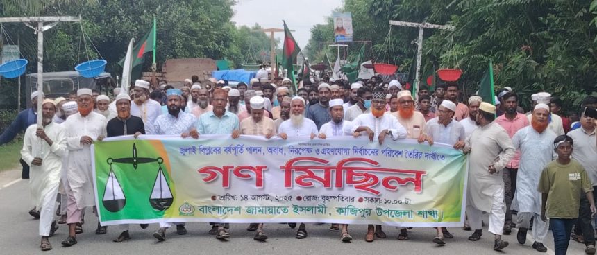১৪ আগস্ট (বৃহস্পতিবার) সকাল ১০টায় কাজিপুর উপজেলার মেঘাই বাজার থেকে শুরু হওয়া মিছিলটি উপজেলার বিভিন্ন সড়ক প্রদক্ষিণ করে আলমপুর চৌরাস্তা মোড়ে পথসভায় মিলিত হয়। উপজেলা জামায়াতে ইসলামের আমির অধ্যাপক জাহিদুল ইসলাম স্বপনের সভাপতিত্বে অনুষ্ঠানে প্রধান অতিথি ছিলেন সিরাজগঞ্জ জেলা জামায়াতের আমির ও কাজিপুর আসনের এমপি পদপ্রার্থী মো. শাহিনুর আলম শাহিন।