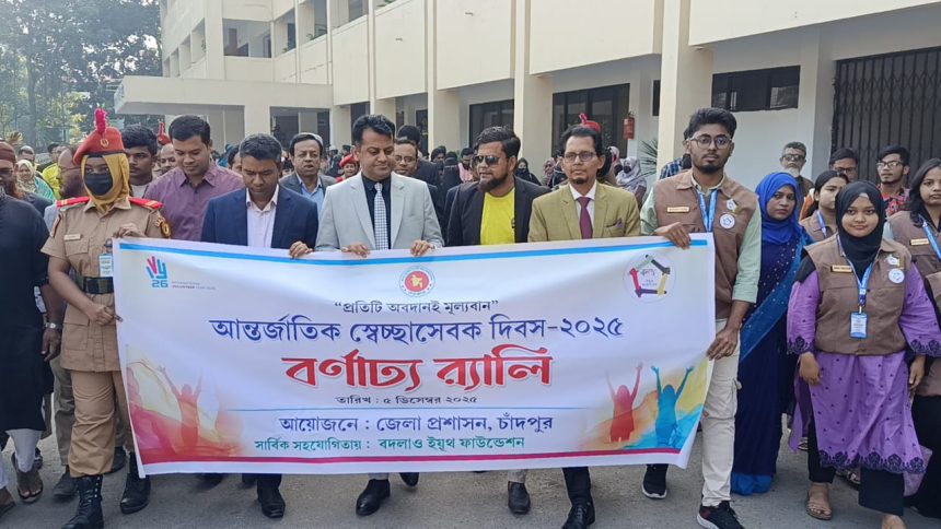 আন্তর্জাতিক স্বেচ্ছাসেবক দিবস-২০২৫ উপলক্ষে শুক্রবার (৫ ডিসেম্বর) সকাল ৯টায় চাঁদপুর সার্কিট হাউস প্রাঙ্গন থেকে একটি বর্ণাঢ্য র্যালি বের হয়। র্যালিটি শহরের গুরুত্বপূর্ণ সড়ক প্রদক্ষিণ শেষে সদর উপজেলা মিলনায়তনে গিয়ে শেষ হয়। পরে সেখানে আলোচনা সভা অনুষ্ঠিত হয়। আয়োজনে জেলা প্রশাসন, সার্বিক সহযোগিতায় বদলাও ইয়ূথ ফাউন্ডেশন। এ বছরের প্রতিপাদ্য ছিল— প্রতিটি অবদানই মূল্যবান।