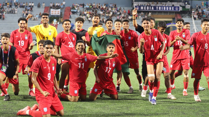 মালদ্বীপের মালেতে সাফ অনূর্ধ্ব-২০ চ্যাম্পিয়নশিপের প্রথম সেমিফাইনালে নেপালকে ১-০ গোলে হারিয়ে ফাইনাল নিশ্চিত করেছে বাংলাদেশ। ম্যাচের প্রথমার্ধে করা মানিকের জয়সূচক একমাত্র গোলটিই লাল-সবুজের প্রতিনিধিদের শিরোপার মঞ্চে নিয়ে যায়। ২০২৪ সালের অপরাজিত চ্যাম্পিয়নরা এবারও শিরোপা ধরে রাখার মিশনে আরও একধাপ এগিয়ে গেল।ম্যাচের শুরু থেকেই আধিপত্য বজায় রেখে খেলতে থাকে বাংলাদেশ। মাঠের নিয়ন্ত্রণে নেপালের চেয়ে যোজন যোজন এগিয়ে ছিল বাংলাদেশের যুবারা। একের পর এক আক্রমণে নেপালের রক্ষণভাগকে ব্যতিব্যস্ত করে রাখে তারা। গোলের জন্য খুব বেশি সময় অপেক্ষা করতে হয়নি বাংলাদেশকে; ১১ মিনিটেই কাঙ্ক্ষিত সেই গোলের দেখা পায় তারা।