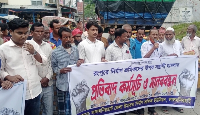 রংপুরে নির্মাণ শ্রমিকদের উপর সন্ত্রাসী হামলার প্রতিবাদ কর্মসূচি ও মানববন্ধন অনুষ্ঠিত হয়েছে। রবিবার (১৯ এপ্রিল) শহরের মিশন মোড় চত্বরে লালমনিরহাট জেলা ইমারত নির্মাণ শ্রমিক ইউনিয়ন, লালমনিরহাট ও জেলা লোড-আনলোড ইউনিয়ন,লালমনিরহাটের আয়োজনে,প্রতিবাদ ও মানববন্ধন কর্মসূচিতে বক্তব্য রাখেন- লালমনিরহাট জেলা ইমারত নির্মাণ শ্রমিক ইউনিয়নের সভাপতি শফিকুল ইসলাম, সাধারণ সম্পাদক মোসলেম উদ্দিন, সংগঠনের সহ-সভাপতি ও বাংলাদেশ নির্মাণ শ্রমিক ফেডারেশন -লালমনিরহাট সদর উপজেলা শাখার সভাপতি আব্দুল জলিল,জেলা লোড-আনলোড ইউনিয়নের সভাপতি বেলাল হোসেন ও সাধারণ সম্পাদক হামিদুল ইসলাম প্রমূখ।