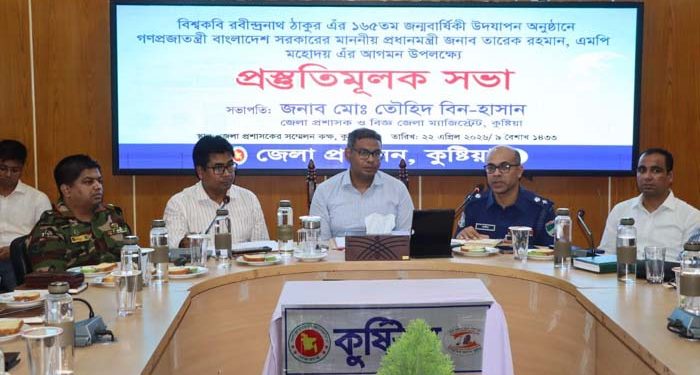 আগামী ৮ মে কুষ্টিয়ায় প্রধানমন্ত্রী তারেক রহমানের আগমন উপলক্ষে সার্বিক প্রস্তুতি নিশ্চিত করতে একটি প্রস্তুতিমূলক সভা অনুষ্ঠিত হয়েছে। গতকাল বুধবার (২২ এপ্রিল) বিকেল ৩টায় জেলা প্রশাসকের সম্মেলন কক্ষে এ সভা অনুষ্ঠিত হয়।