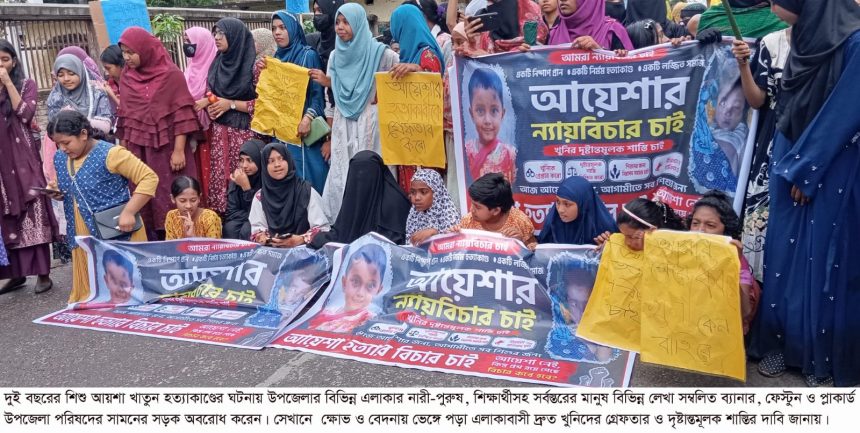 ‘আয়শা হত্যাকারীকে গ্রেফতার করো’, ‘তুমি কে আমি কে-আয়শা আয়শা’, ‘আমার বোন কবরে, খুনি কেন বাহিরে’-এমনন বুক ভাঙা, বেদনাভারাক্রান্ত স্লোগানে সোমবার সকালে কেঁপে ওঠে কুড়িগ্রামের চিলমারী। শিশু আয়শার নির্মম হত্যাকা-ের প্রতিবাদ আর ন্যায়বিচারের আকুতিতে এলাবাসীর আয়োজনে অনুষ্ঠিত কর্মসূচীতে রাজপথে নেমে আসে হাজারো মানুষ। শোক আর ক্ষোভ মিশে একাকার হয়ে ওঠা সেই অবরোধ ও বিক্ষোভ কর্মসূচি যেন হয়ে ওঠে একটি জনপদের নীরব কান্নার উচ্চারণ।