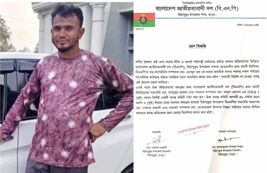 ​ফ্যামিলি কার্ড দেওয়ার প্রলোভন দেখিয়ে এক নারীকে ধর্ষণচেষ্টার অভিযোগে রংপুরের মিঠাপুকুরে এক বিএনপি নেতাকে দল থেকে সাময়িক বহিষ্কার করা হয়েছে। অভিযুক্তের নাম মো: এনামুল হক, তিনি উপজেলার ৪নং ভাংনী ইউনিয়ন বিএনপির সহ-সংগঠনিক সম্পাদক ছিলেন। ২৮ এপ্রিল ২০২৬ তারিখে প্রকাশিত সংবাদ অনুযায়ী, এনামুল হকের বিরুদ্ধে
