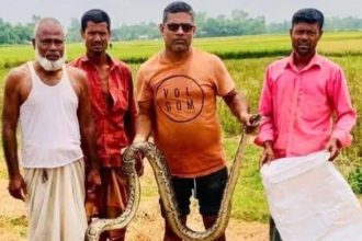 শ্রীমঙ্গলে জেলের জালে আটকা অজগর সাপ উদ্ধার