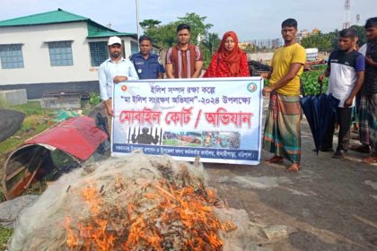 বানারীপাড়ায় মা ইলিশ সংরক্ষণ অভিযানে বিপুল পরিমাণ জাল জব্দ