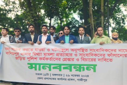 গাজীপুরে সাংবাদিকদের নামে মিথ্যা মামলার প্রতিবাদে মানববন্ধন
